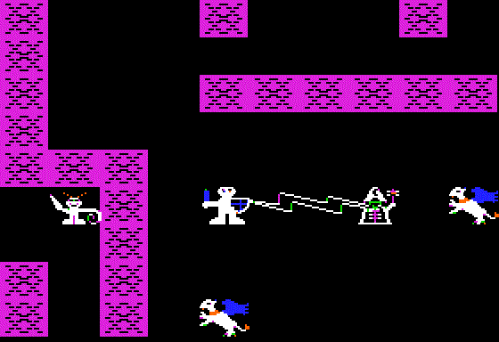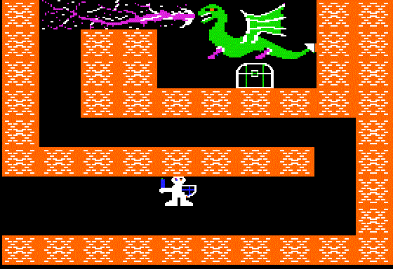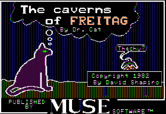 Caverns of Freitag is an action role-playing game for the Apple II, written in 1982 by David Shapiro (a/k/a "Dr. Cat"). It has the standard elements -- running around in a maze bashing various monsters to death to become strong enough to face the boss -- making it one of the earliest examples of the ARPG genre. The interface is a clever mix of text and hi-res graphics.