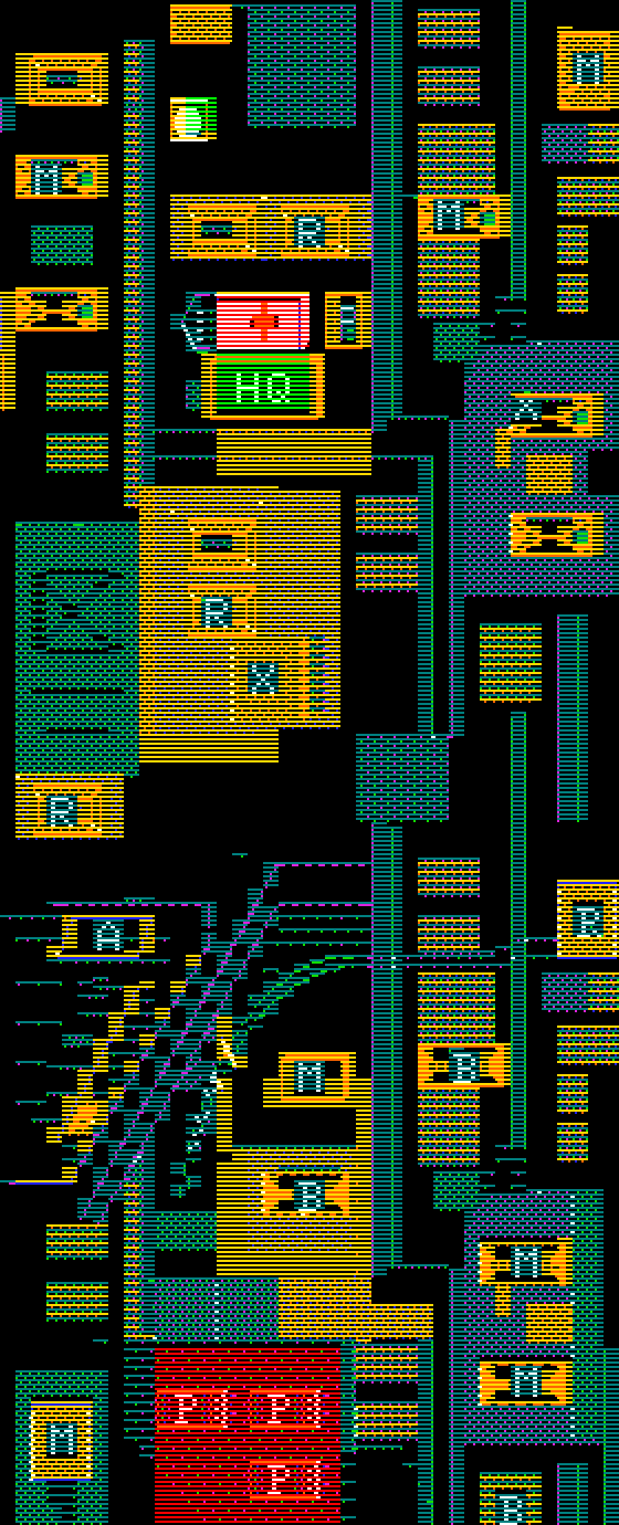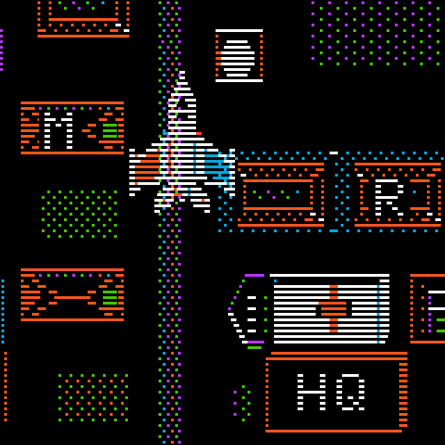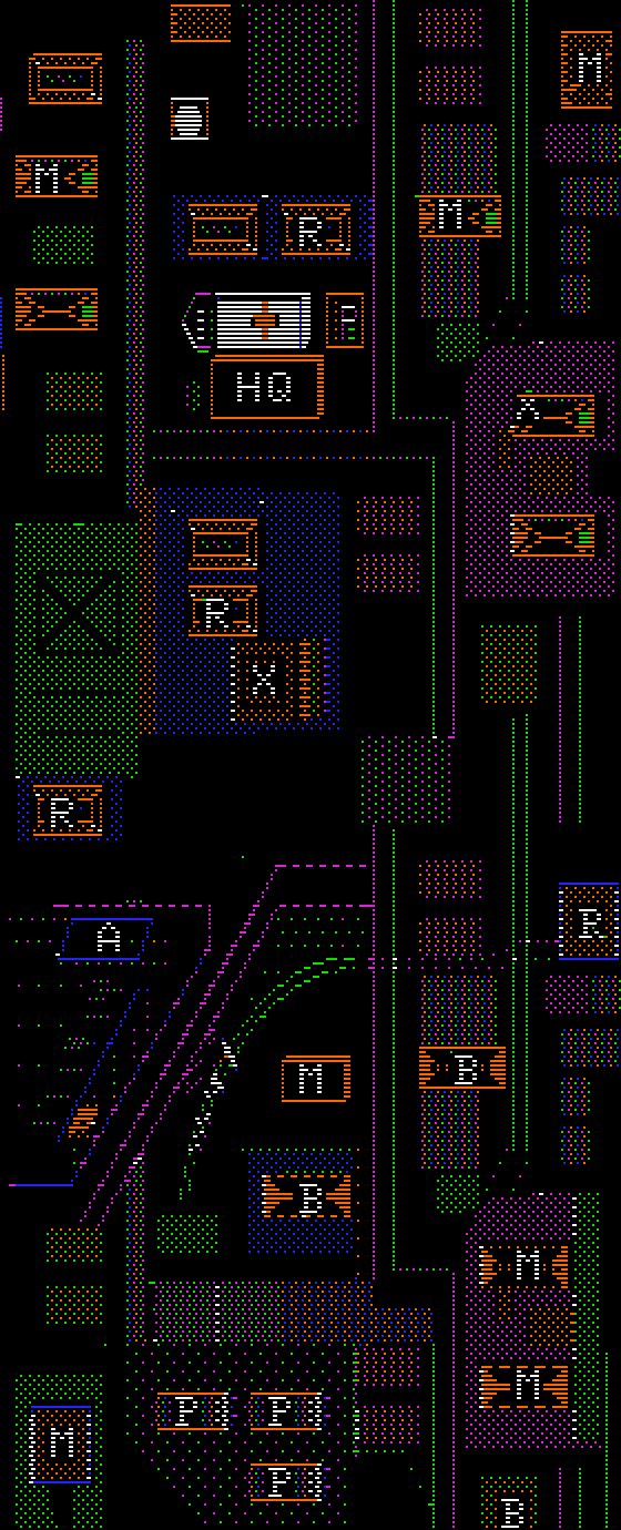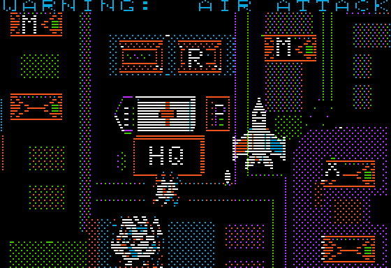If you look closely you'll see a couple of oddities. The buildings with letters on them are colored high-value, but the letters themselves were drawn with white/black that had bit 7 clear. So if you drop a bomb right on the letter it's a medium-value target.
