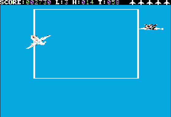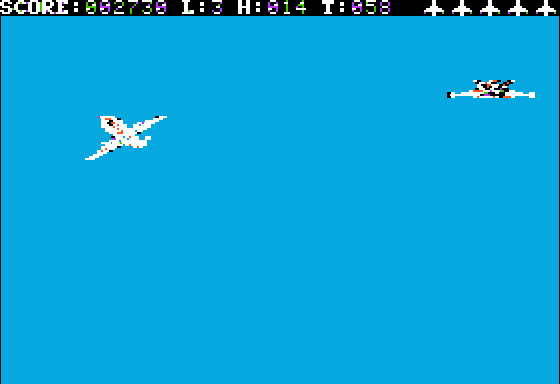 If you survive an air attack, the difficulty level increases. It starts at 1 and goes up to 5. The difficulty level determines how frequently flak bursts are fired, and how quickly the planes move during dogfights. If your plane is destroyed in either phase, the difficulty level decreases by one. There is no change in scoring at higher difficulties.