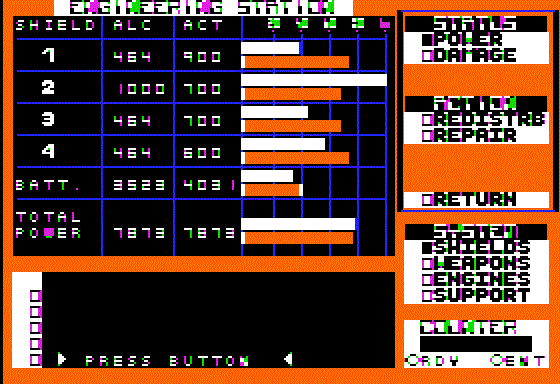 - Damage done to enemy ships is deducted twice, once in "TARGET" (line 27150 for torps, 27550 for positrons), and once in "INFO1" (line 58060). This doubles the effectiveness of the Ranger's weapons, though the second deduction is purely an energy drain. The second deduction of VH(SH) is done after the energy reallocation is done, and looks like an attempt to ensure that damage is reflected on the shield after the reallocation, but the subtracted energy isn't added back to the battery. The total energy in KP(SH,0) is now inaccurate, but won't be recomputed until next turn, so looking at the ship from the Science station doesn't show the energy drain (which is probably how it was missed in testing). The implementation should have capped the shield alloc, not subtracted power.